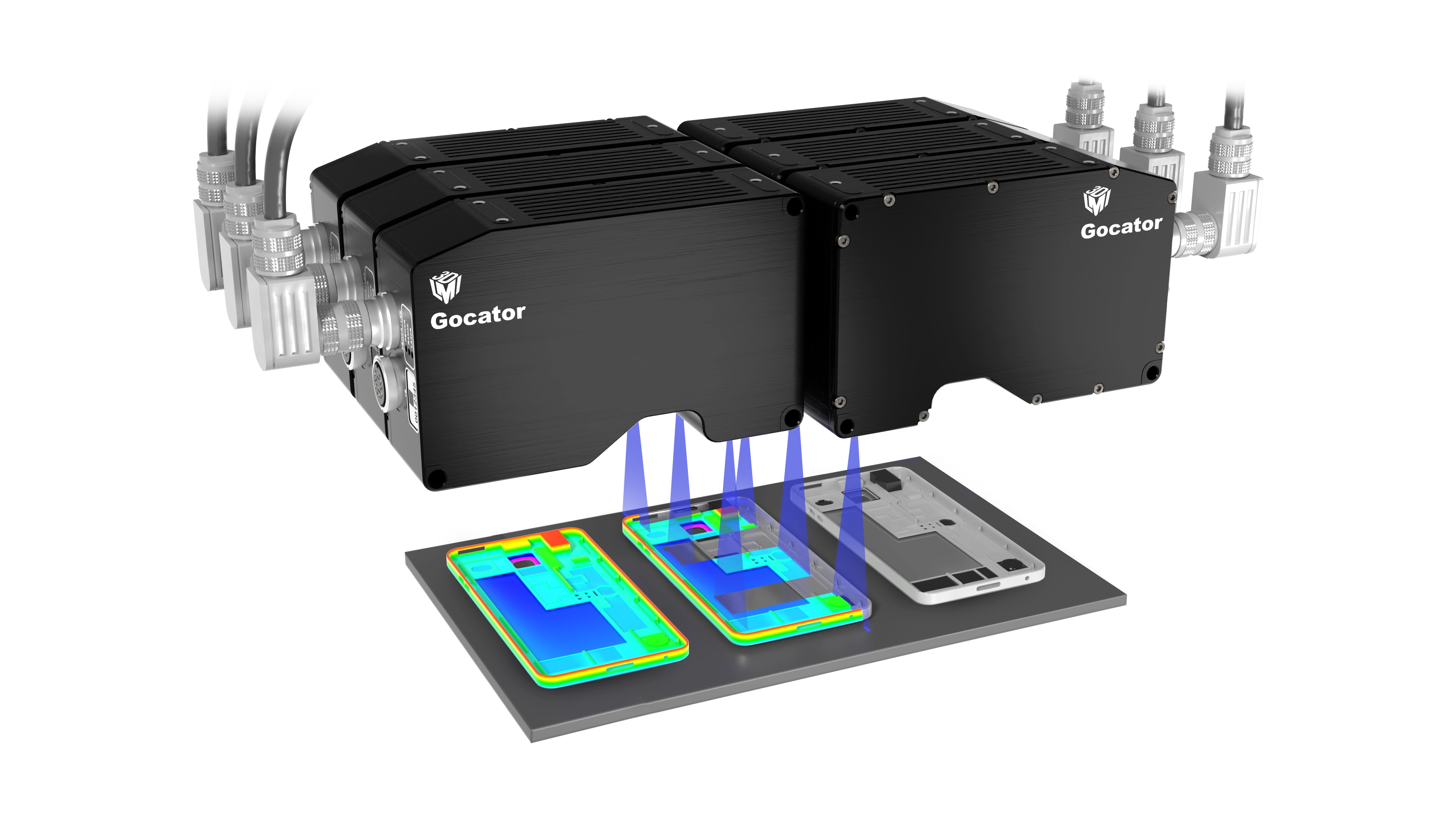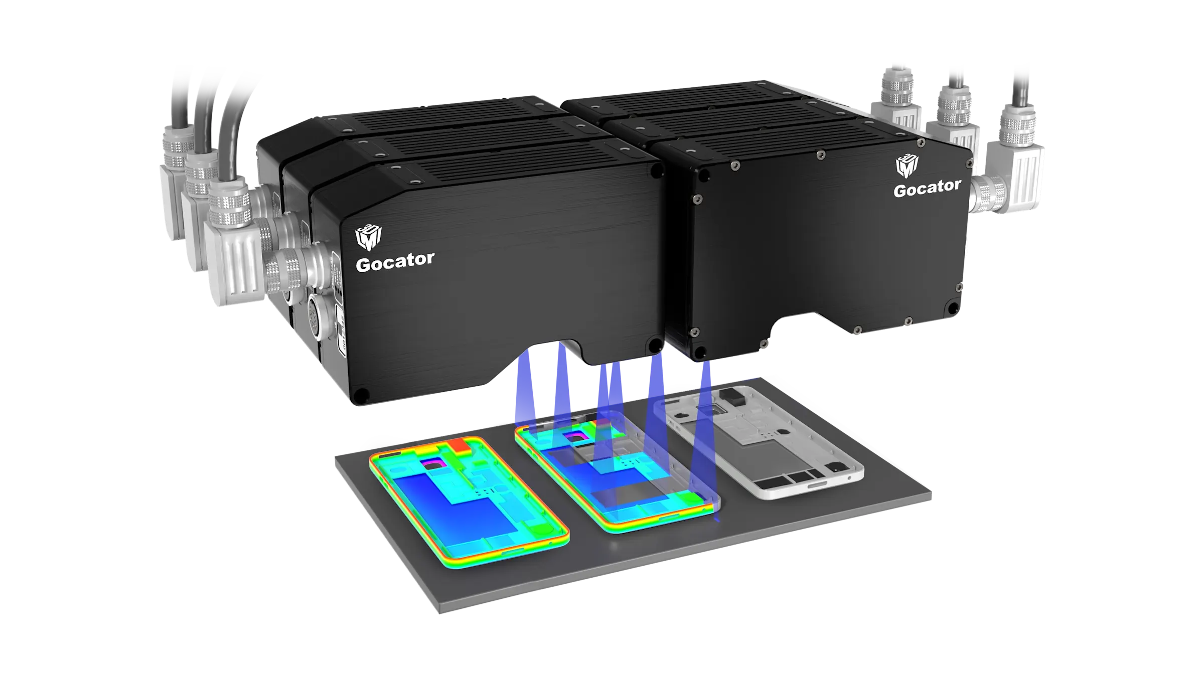 簡單且直覺的多感光元件設定,可將多個感光元件的資料自動對齊為單一 3D 掃描,並將未量測區域降至最低。透過兩台 Gocator 2420 感光元件對觸控板進行掃描,可用於檢查表面平坦度(組裝前與組裝後)。